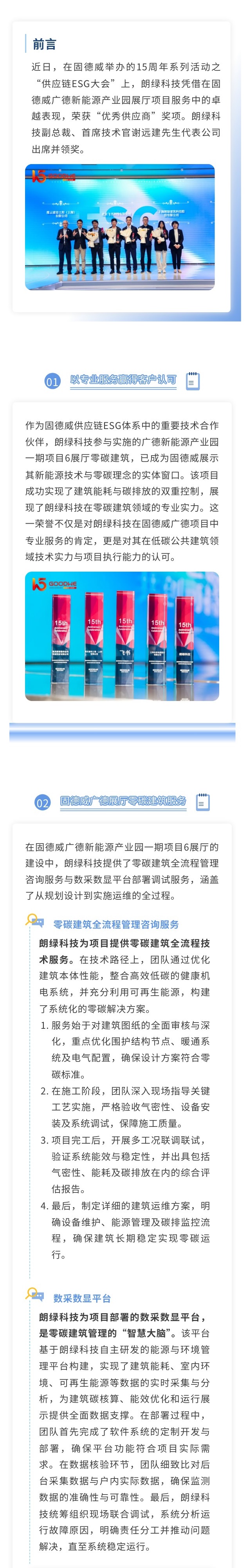 11月7日,在固德威举办的15周年系列活动之“供应链ESG大会”上,朗绿科技凭借在固德威广德新能源产业园展厅项目服务中的卓越表现,荣获“优秀供应商”奖项。朗绿科技副总裁、首席技术官谢远建先生代表公司出席并领奖。